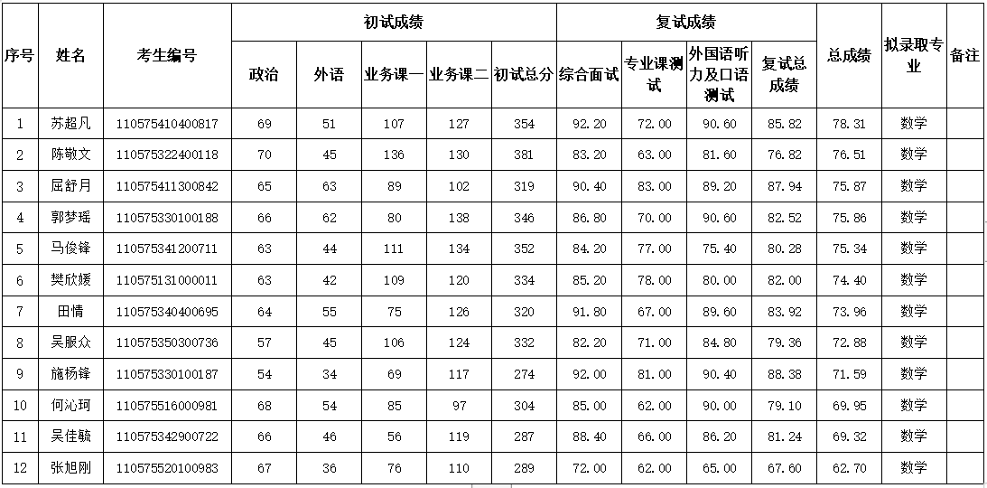 备注:复试成绩=综合面试×50%+专业课测试×30%+外语听力及口语面试×20%