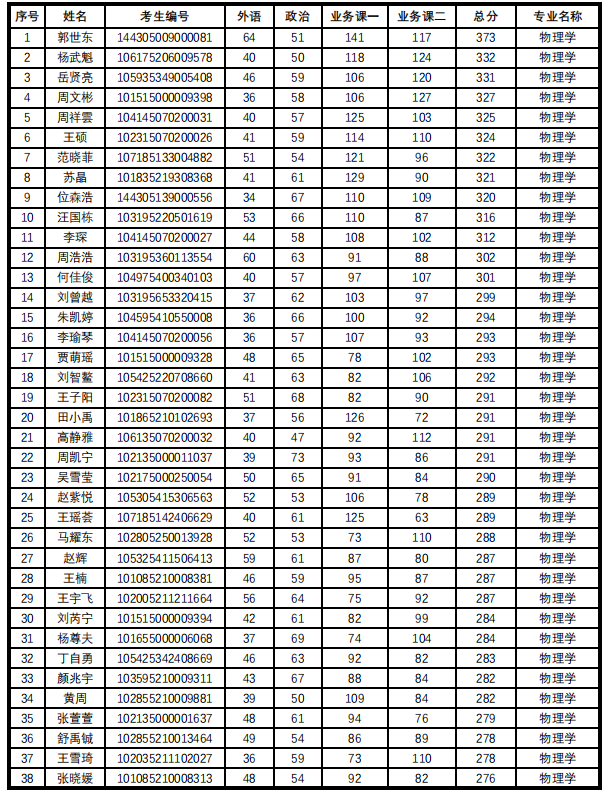 根据《bbin-bbin平台 2025年硕士研究生招生复试录取工作实施细则》中物理学调剂的基本要求,及复试比例1:1.8的差额,按照初试总分由高到低的原则,复试面试名单如下: