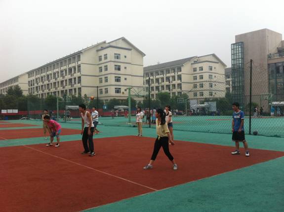 2013年5月29日傍晚,在夏日凉爽的微风吹拂下,学生第一党支部的本学期第四次活动——排球比赛拉开了序幕。赛前准备工作就绪后,党支部的成员们也陆续地来到了场地开始了热身运动。爱好运动的男生们很快地就拿着球跑到场地上开始练习,女生们也不甘示弱地摆好接球的手势,俨然一副临阵对敌的气势。