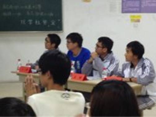 由周金田、杨夏煜、陈瑞溢、张伟伟组成的物理121班的辩论赛团队早早等候在现场,而物理121班其他成员更是倾巢而出,将比赛现场的氛围多次点燃。