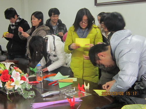 接着我们把折好的千纸鹤用细绳串起来,并在纸鹤的翅膀上写上“祝老师妇女节快乐”等字样,送给学院的女教师,希望她们能感受到学生的感恩之心,天天都能开心快乐!