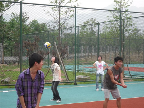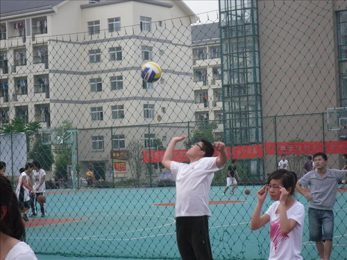 今天有好些人是第一次碰到排球,可是他们都没放弃这个和大家一起交流的机会,他们并不怕输,依然毫不畏惧的站在球场上。我们公平分组,每组都是水平相当的,故也不存在水平悬殊。我们的比赛是不正规的,对发球没有硬性要求,因为我们是以娱乐为主。但我们遵循一般的规则如比赛中球不能落地,不得持球、连击;每个队员都要进行位置轮转等等。虽然男生都不会打排球,但经过我们女生简单的讲解和指挥,本次活动也搞得有声有色。