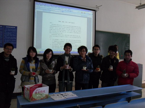 班会中,每个寝室都派出了一名代表上台演讲。同学们讲述了植树节的由来,讲述当今世界人们面临的一些环境问题,也讲述了有关环保的小知识.在同学的演讲过程中,同学们时而热烈鼓掌,时而陷入沉思中,时而脸上露出若有所得的喜悦。在一个代表发表演讲后,台下会有七名群众评委对其打分,然后对每个寝室代表的演讲得分进行排名。最终按照排名的顺序,代表们先后为各自寝室挑选一盆盆栽(盆栽是集体代表购买回来的),接着每个寝室派一个代表捧着盆栽合影留念,将快乐的一刻留作永恒。同时,全班8个寝室同时进行了寝室绿化活动,为营造一片安静,绿色,温馨的寝室而努力。通过此次会议,同学们纷纷表示会在平时为“植绿、爱绿、护绿、兴绿”特别是“爱绿、护绿”多做贡献的。