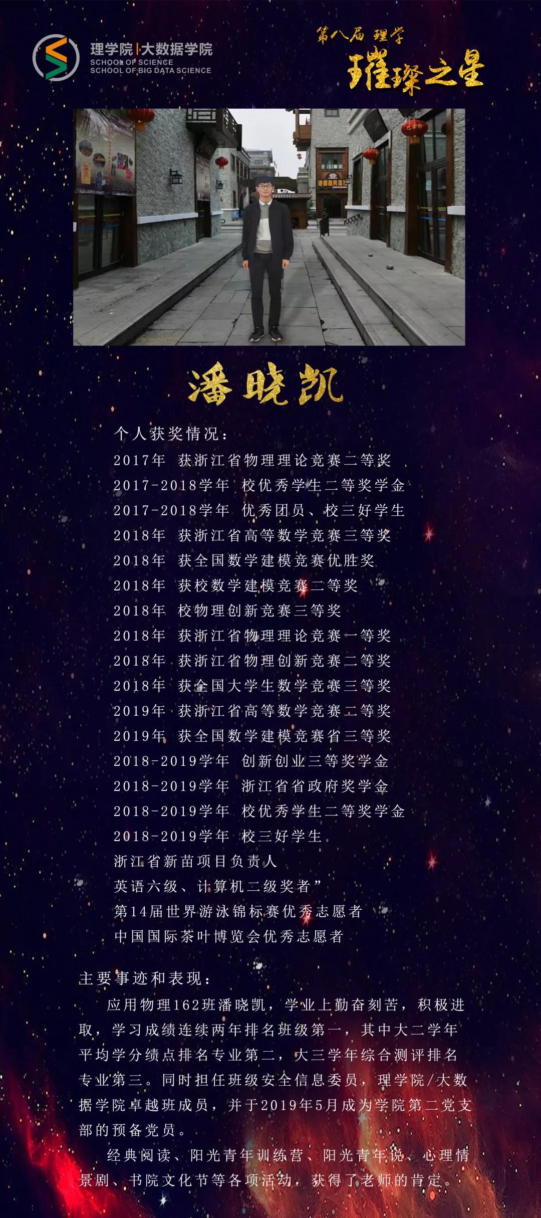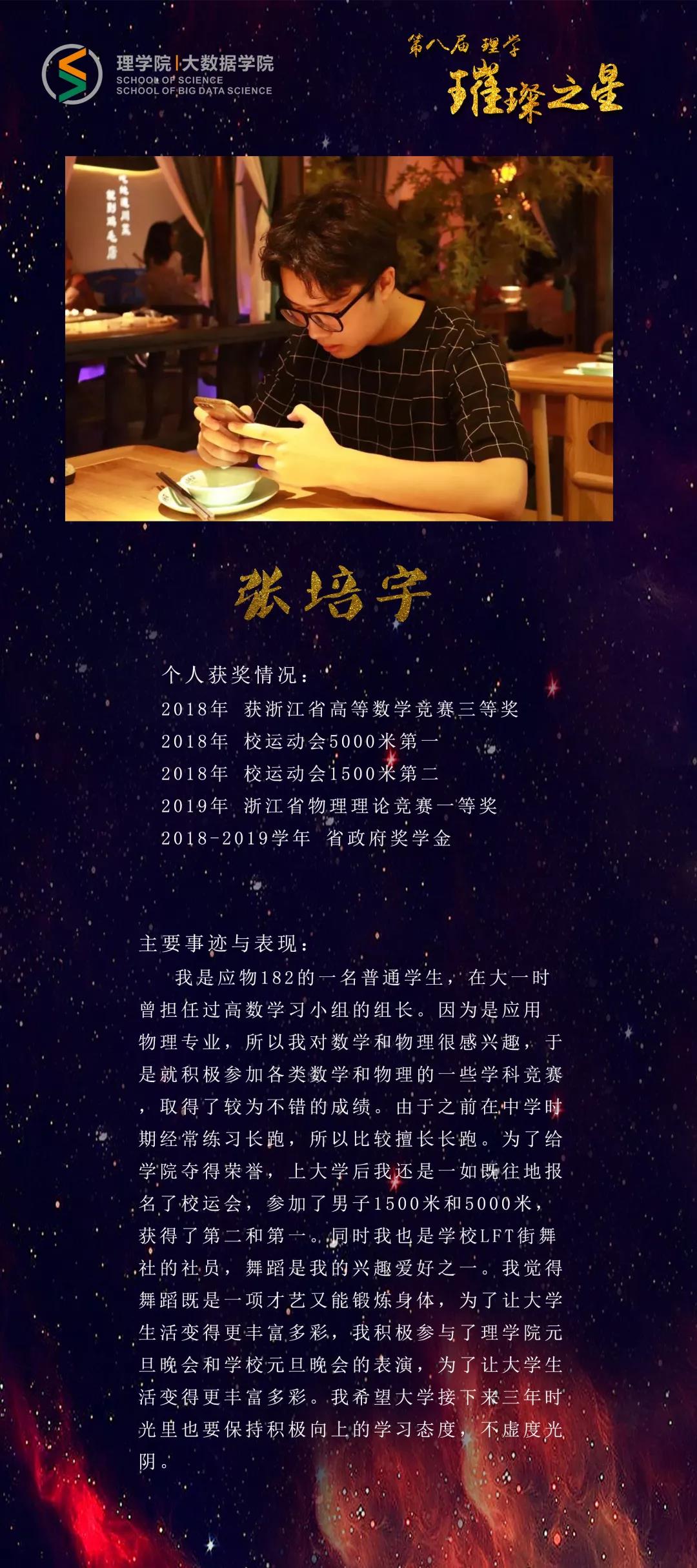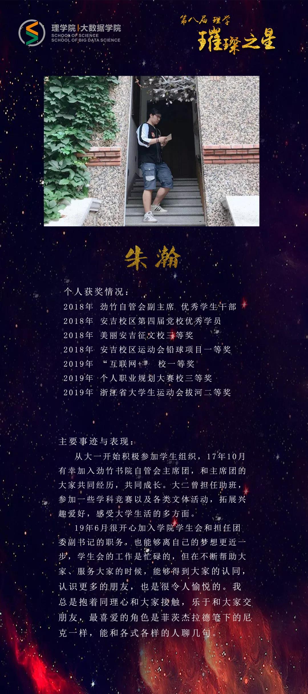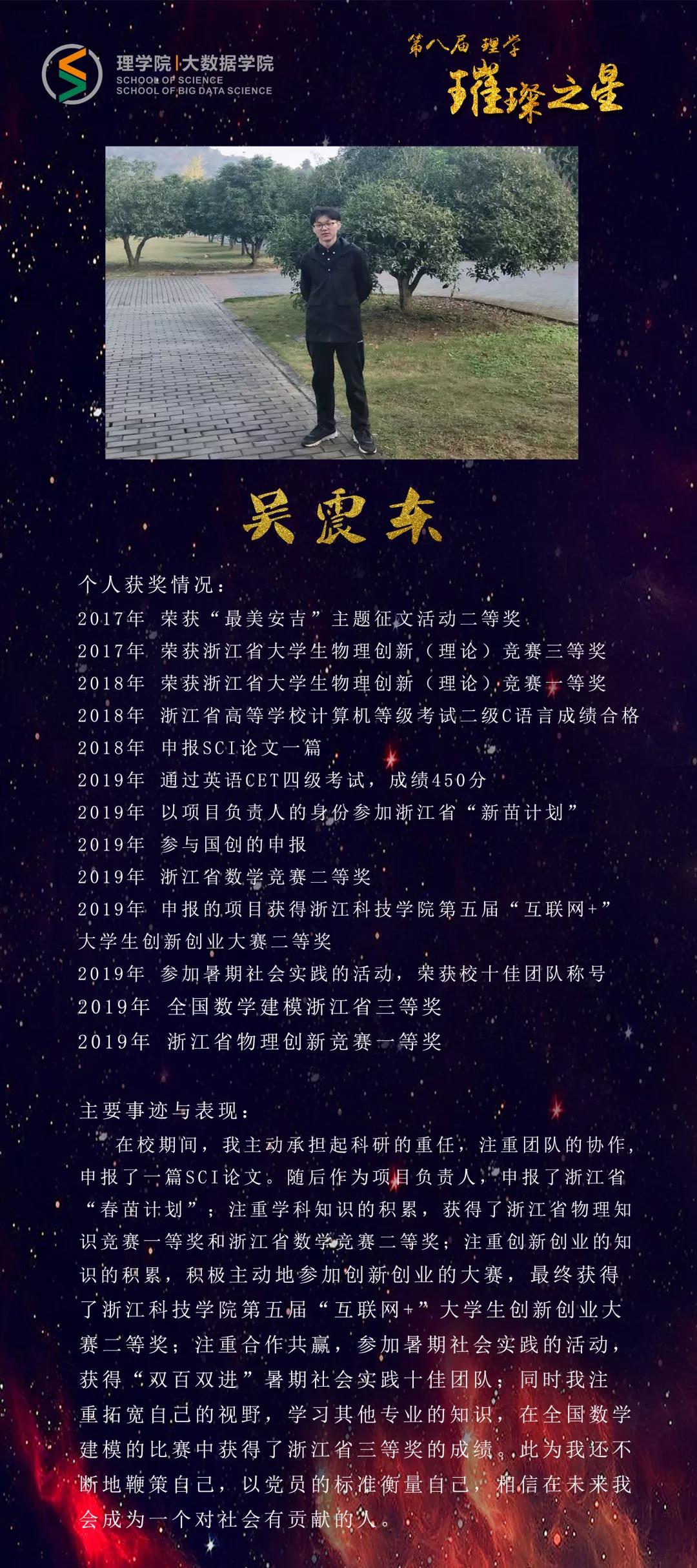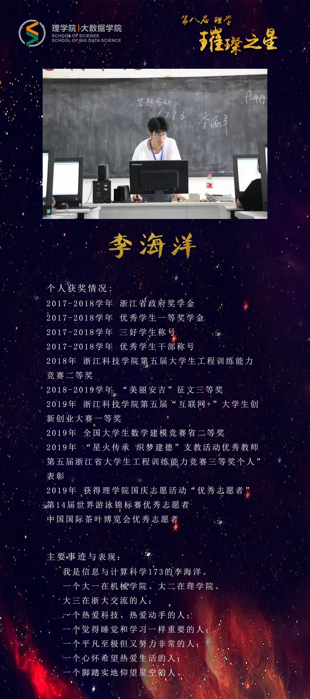 他,敏而好学,徜徉在理学的海洋中;他,目标明确,对大数据一往情深。他满载梦想,在浙理绽放耀眼光芒;他激荡青春,在浙理诠释活力无限;他志存高远,在浙理吟诵时代凯歌。