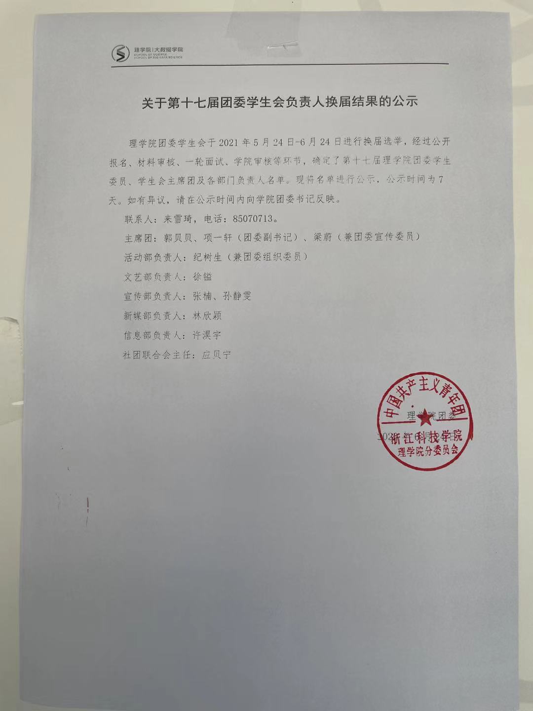 团委学生委员、学生会主席团及各部门负责人名单。现将名单进行公示,公示时间为7天。如有异议,请在公示时间内向学院团委书记反映。