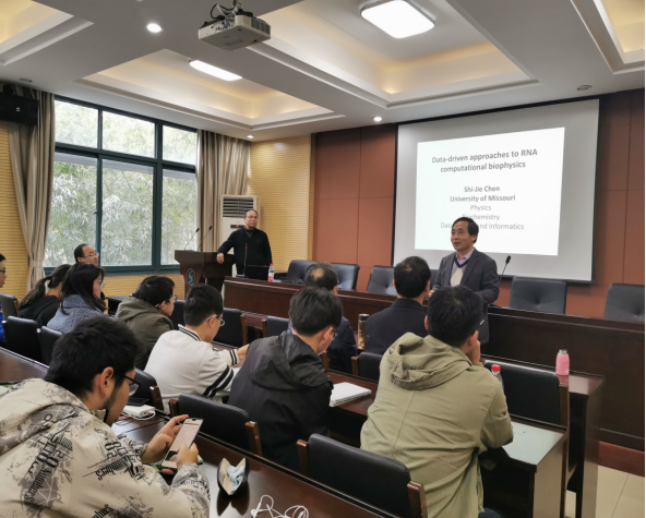 做了题为“Data-driven methods for RNA computational biology”的精彩学术报告。陈世杰教授2012年当选为美国物理学会(APS)Fellow,是密苏里大学董事会冠名杰出教授,任职于密苏里大学物理与天文系、生物化学系、数据科学与信息学研究院,一直从事RNA的多领域交叉科学研究。报告由浙江科技学院党委委员、bbin