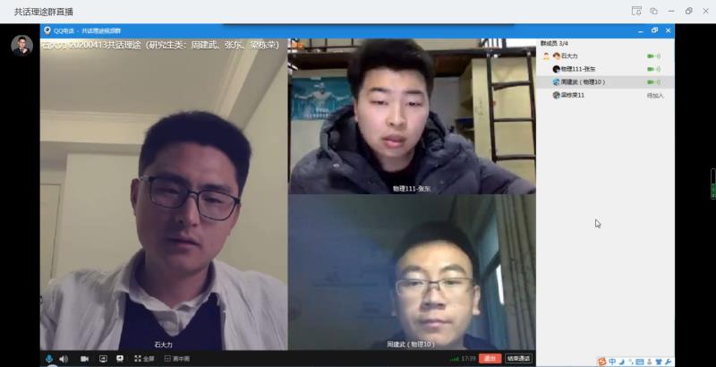 开展第二期“共话理途”校友分享会,旨在分享理学专业的职业前途、理学学子的职业前途、相关行业的发展前途。会议邀请嘉宾10级周建武、11级张东、梁栋荣两位校友应邀出席,通过钉钉直播与学院在校生共享考研经验,助力理学学子共同成长,会议由院学工办主任石大力主持。