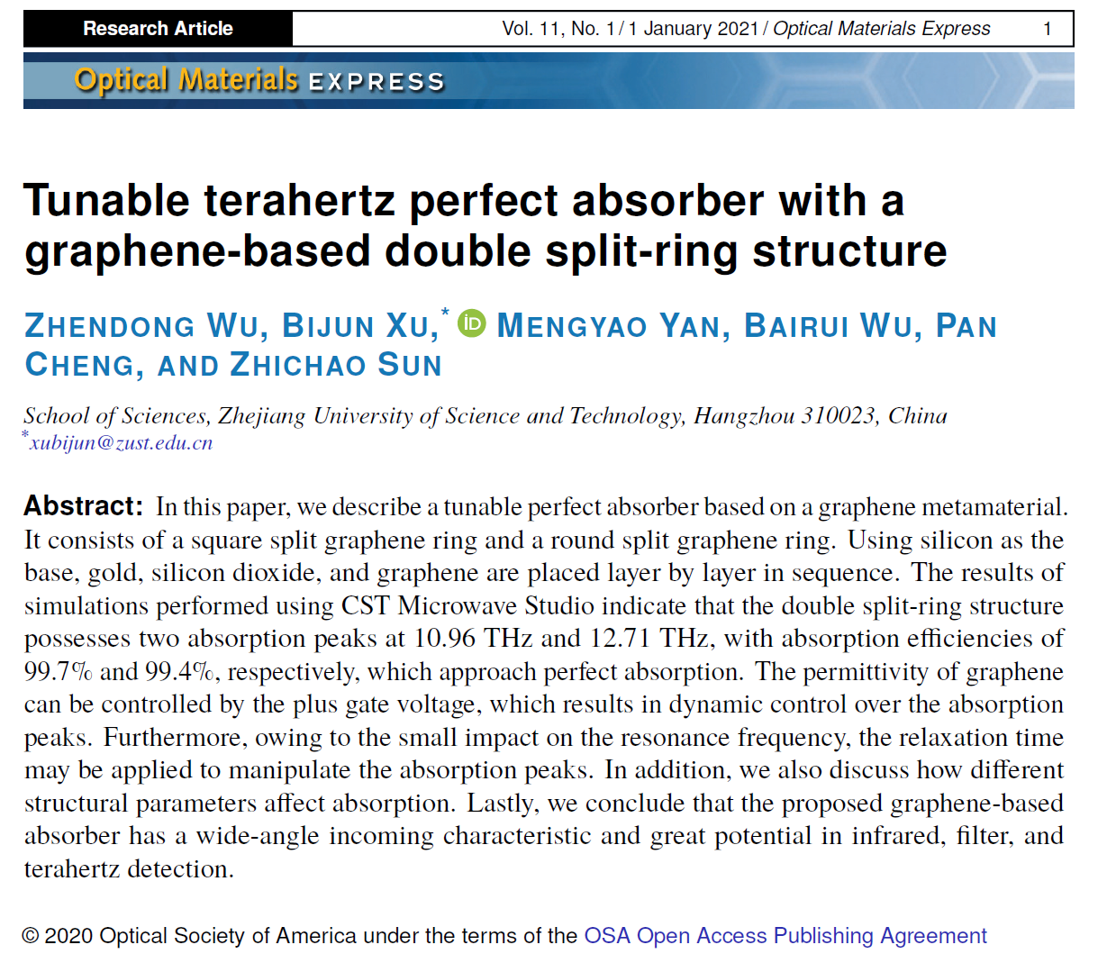 2017级应用物理学本科生吴震东同学在徐弼军老师指导下以第一作者身份在国际知名期刊《Optical Materials Express》(IF=3.064, JCR1区)再次发表了一篇高质量学术论文,报道了超材料在太赫兹频段吸收损耗特性的最新研究成果。浙江科技学院为论文的第一署名单位,徐弼军老师为论文通讯作者。此次发表的论文是继2020年6月他在期刊《Plasmonics》(IF=2.926,)首次一作发表论文后的第二篇一作研究论文。