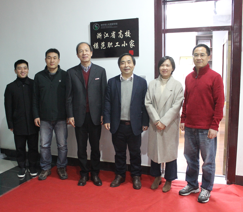 “浙江省高校模范职工小家”正式揭牌。校党委副书记周加敏、校党委委员/学院院长陶祥兴、学院党委副书记(主持工作)张掬婴、学院党委委员/分工会主席章迪平、学院党委委员房启全、办公室主任王铁军和师生代表出席揭牌仪式。
