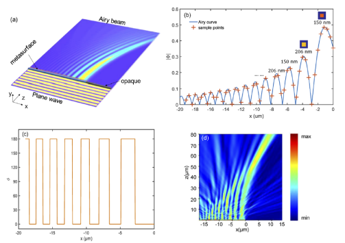 艾里光束具有一些不同寻常的特性,如无衍射、自愈、以及独特的自弯曲行为。本论文使用超构表面代替了传统上复杂的光学系统,对艾里光束的产生及其特殊性质进行了研究。介质材料的使用有效提高了产生艾里光束的效率,在635纳米红光照射下,艾里光束的产生效率约为58%。同时,论文还使用超构表面验证了艾里光束的自愈,自聚焦性。