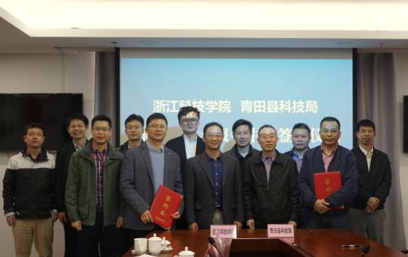 与青田县共建“青田县鞋产业技术服务中心”签约仪式在青田县科技局举行,副校长冯军、青田县科技局局长章旭阳、校科技处处长马伟峰、bbin