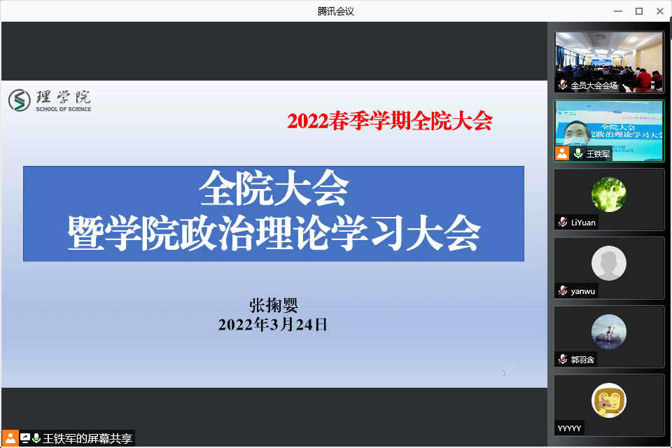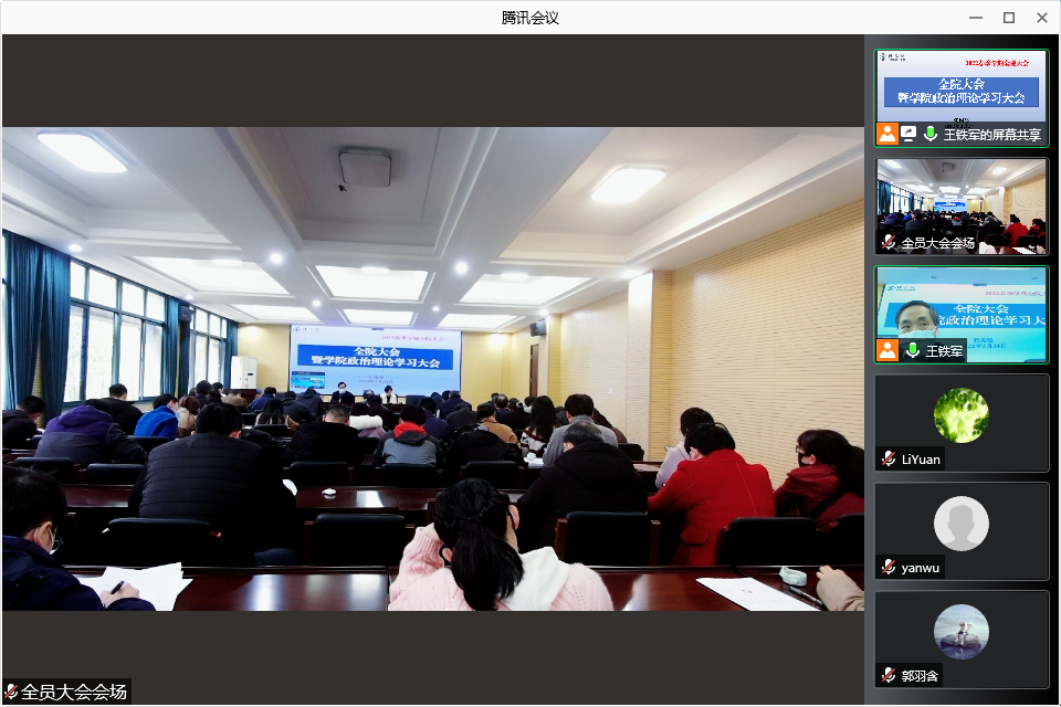 召开全院大会传达学习全国两会精神。党委书记张掬婴主持会议。会议采取线上与线下相结合的形式,院领导、全体教职工参会。