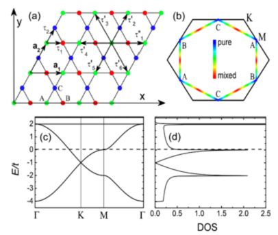 近年来,新型笼目超导体CsV3Sb5的发现引起了研究者的广泛关注和极大的研究热情。由于其特殊的晶格结构 [图(a)],具有二维笼目结构的材料能带中往往具有平带 [图(c)]、范霍夫奇异点和类似于石墨烯的狄拉克型色散 [图(d)],因而能够诱导产生一系列关联拓扑物态。特别是在范霍夫奇异点(van Hove singularities)掺杂附近,理论预测二维笼目体系可呈现出新奇的超导电性和丰富的电子有序态,还有可能获得拓扑非平庸的超导态。