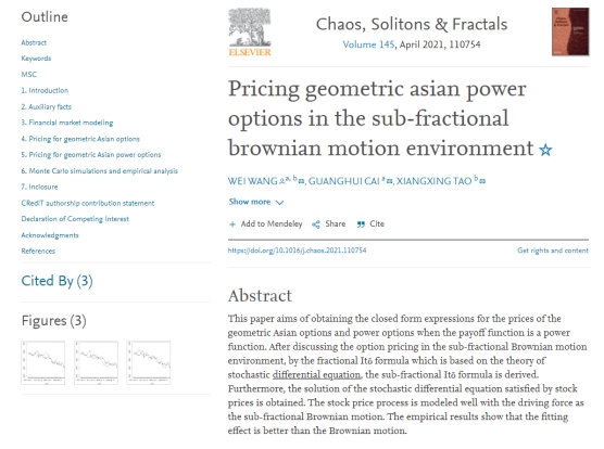 数学与统计系王伟博士作为第一作者和通讯作者在国际权威期刊《Chaos, Solitons & Fractals》上发表了题为“Pricing geometric Asian power options in the sub-fractional Brownian motion environment”的研究论文(//doi.org/10.1016/j.chaos.2021.110754)。