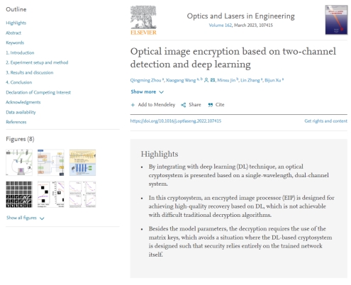 光子与光场调控及应用研究团队汪小刚教授指导的应用物理系2021级研究生周清明同学以第一作者身份在光学工程领域著名学术期刊《Optics and Lasers in Engineering》(影响因子5.666,JCR一区、中科院二区)上发表了题为“Optical image encryption based on two-channel detection and deep learning”的研究论文,浙江科技学院为第一署名单位,汪小刚和徐弼军分别为论文通讯作者和共同指导教师。