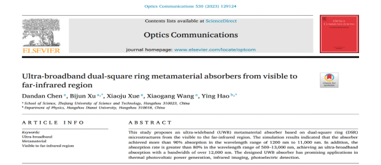2、研究团队2021级研究生陈丹丹同学以第一作者身份在期刊《Optics Communications》上发表了题为“Ultra-broadband dual-square ring metamaterial absorbers from visible to far-infrared region”的研究论文。浙江科技学院为第一完成单位,应用物理系徐弼军和汪小刚分别为论文通讯作者和共同指导教师。《Optics Communications》是爱思唯尔(Elsevier)旗下的光通信领域前沿期刊,2021-2022年的影响因子2.335, SCI中科院三区。