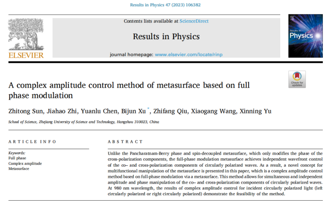 光子与光场调控及应用研究团队中2020级研究生孙志通以第一作者身份在《Results in physics》 期刊上发表了题为“A complex amplitude control method of metasurface based on full phase modulation”的创新研究文章。浙江科技学院为第一完成单位,应用物理系徐弼军和汪小刚分别为论文通讯作者和共同指导教师。《Results in physics》是ELSEVIER旗下著名期刊,影响因子4.565,中科院分区SCI二区期刊。