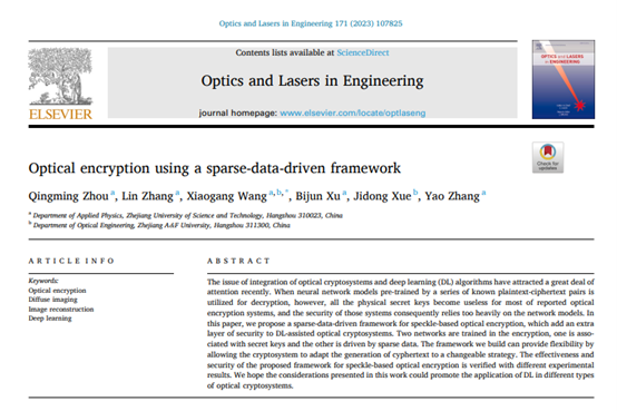 团队在深度学习应用于光学信息安全的研究方面,相关研究成果以论文形式发表在国际光学领域知名期刊Optics and Lasers in Engineering上(期刊影响因子4.6,中科院SCI二区,JCR Q1)。该论文题为“Optical encryption using a sparse-data-driven framework”。物理系2021级研究生周清明为本文的第一作者,汪小刚教授和徐弼军教授分别为通讯作者和共同指导老师,浙江科技学院为第一单位。该研究得到了国家自然科学基金的支持。