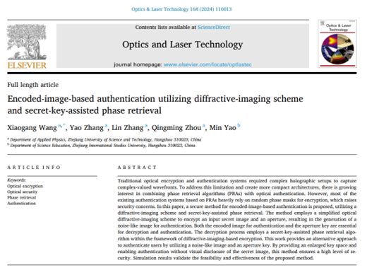 院光子与光场调控研究团队在“光学信息加密与认证”研究方面取得重要进展,相关研究成果以论文形式发表在国际光学领域知名期刊Optics & Laser Technology上(期刊影响因子5.0,中科院SCI二区,JCR Q1)。论文题为“Encoded-image-based authentication utilizing diffractive-imaging scheme and secret-key-assisted phase retrieval”。汪小刚教授为第一作者和通讯作者,浙江科技学院为第一单位。该研究得到了国家自然科学基金和浙江省自然科学基金的支持。