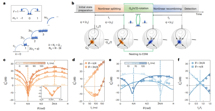 量子纠缠提供了超过标准量子极限的测量精度。然而,由于在制备、控制和检测量子纠缠方面的实验限制,具有较大增强的实验观测,仍然极具挑战性。本研究通过自旋混合动力学产生自旋-向列压缩态,利用26400个原子的大系综,实现了超越标准量子极限的15.6±0.5dB灵敏度,可用于检测小角度拉比Rabi旋转,以及16.6±1.1dB的灵敏度,可用于Ramsey干涉测量应用中的相位传感。该研究为基于超冷原子的精密测量应用奠定了基础。利用回声实现时间反演的方案可以直接推广到有类似相空间结构的Lipkin-Meshkov-Glick (LMG)模型中,从而为在其他自旋系统中实现非线性干涉仪提供了新的思路。
