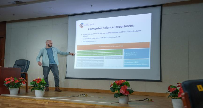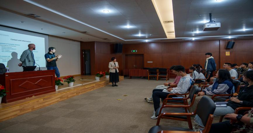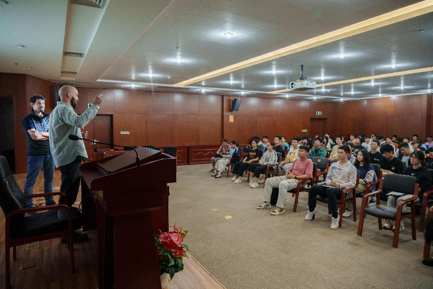 为帮助中法大数据的学生进一步理解法方合作学校,做好学习规划,10月27日,法国塞吉巴黎大学的老师Clement, Sajad分别从教学特色、科研优势等方面向中法大数据23级学生介绍了法国塞吉巴黎大学,并详细介绍了中法大数据项目的特色优势,法语学习的重要性,出国交流学习的机会等,为大家了解本项目、规划后续学习提供了极大的帮助。此外,学生就报告内容与两位老师展开热烈的讨论。(中法大数据项目秘书 吴哲安)