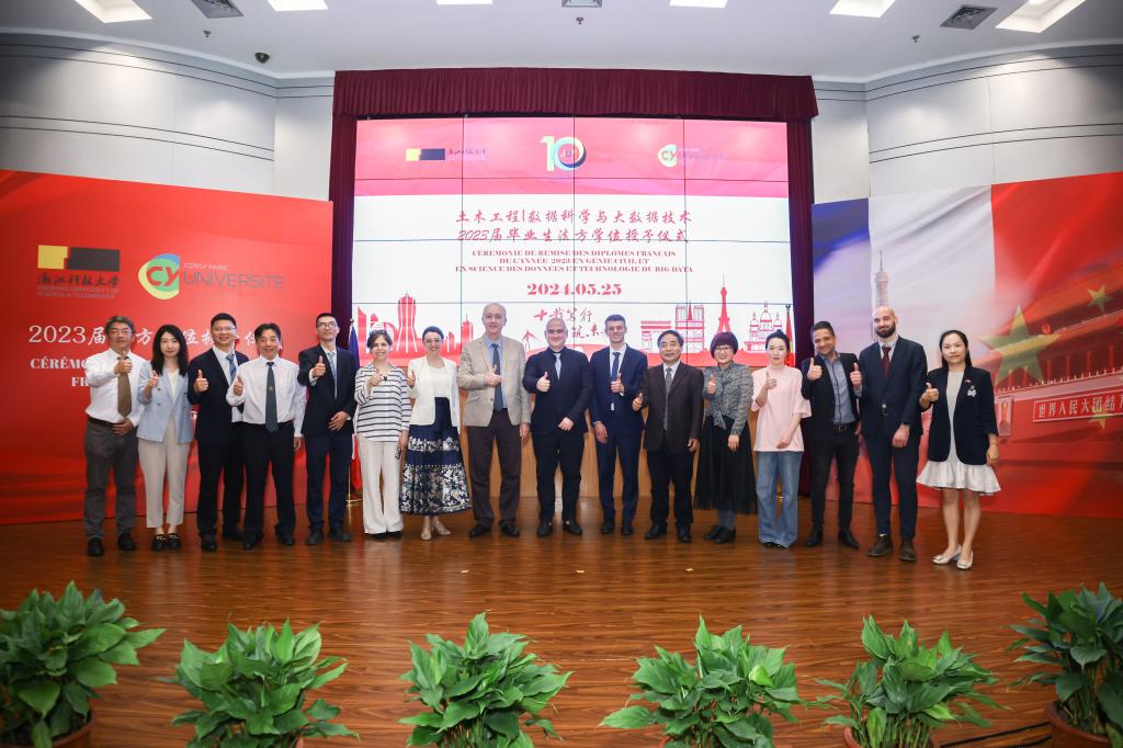成为全国首个在大数据领域开展中外合作办学的高校。自2019年9月项目正式招生以来,现有286名学生就读该项目。项目的首届毕业生共有54名,他们均获得中法双学位,就业率达到100%,其中近50%的学生实现高质量就业。毕业生中共有15名学生选择继续深造,其中7人进入法国顶尖的索邦大学和萨克雷大学,3人前往英语国家QS排名前50的世界名校,另有5人选择在国内攻读硕士研究生。这一成绩充分说明中法大数据项目的运行良好,获得了学生、家长以及法国合作学校等各界的高度评价,进一步提升了学校和学院在国际上的美誉。