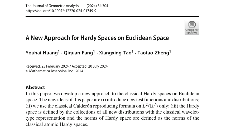 近日,实分析与调和分析及应用团队在J. Geom. Anal. 上发表了题为“A New Approach for Hardy Spaces on Euclidean Space”的研究论文。此论文bbin-bbin平台
