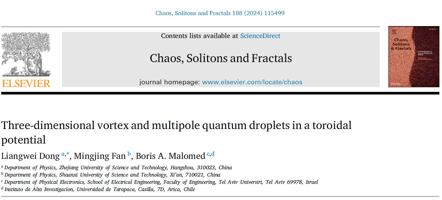 非线性物理团队在量子液滴演化动力学领域取得重要进展,相关研究成果以“Three-dimensional vortex and multipole quantum droplets in a toroidal potential”为题,发表于非线性物理国际权威期刊《Chaos Solitons & Fractals》(中科院大类一区)。董亮伟教授为第一兼通讯作者,bbin-bbin平台