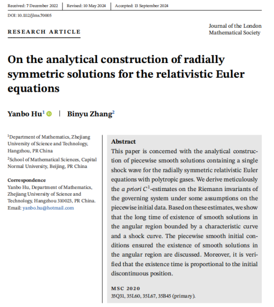 1. Yanbo Hu, Binyu Zhang, On the analytical construction of radially symmetric solutions for the relativistic Euler equations, J. London Math. Soc., 110 (2024): e70005, 55 pages. (中科院2区,数学类T2)