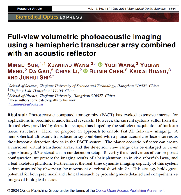光子与光场调控研究团队在光声成像研究领域取得进展,相关研究成果以“Full-view volumetric photoacoustic imaging using a hemispheric transducer array combined with an acoustic reflector”为题,发表于光学领域期刊《Biomedical Optics Express》(影响因子2.9,中科院2区)。bbin-bbin平台