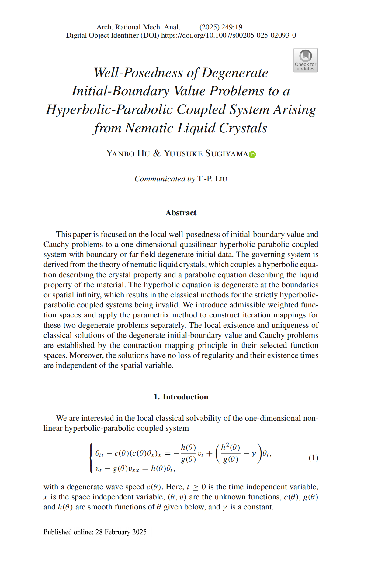 近日,非线性偏微分方程团队胡燕波教授与日本The University of Shiga Prefecture的Yuusuke Sugiyama教授合作,在Archive for Rational Mechanics and Analysis(理性力学与分析档案,简称ARMA)上发表了题为“Well-Posedness of degenerate initial-boundary value problems to a hyperbolic-parabolic coupled system arising from nematic liquid crystals”的研究论文,全文66页。该论文胡燕波教授为第一作者,bbin-bbin平台