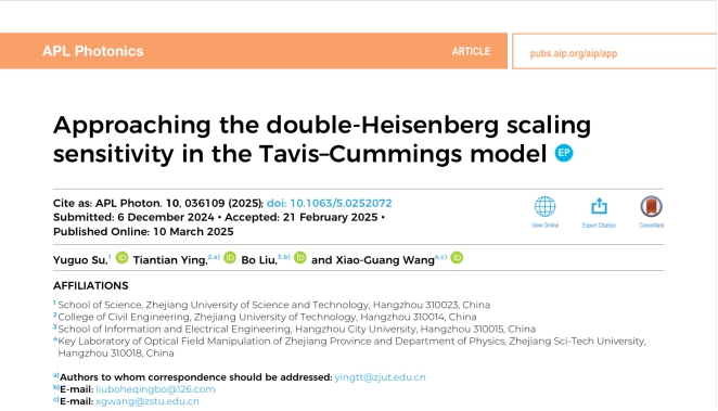 应用物理系量子信息物理研究团队在国际学术期刊《APL Photonics》(IF=5.6,中科院一区)期刊上发表了题为"Approaching the double-Heisenberg scaling sensitivity in the Tavis-Cummings model"的研究论文,该论文被选为Editor's Pick(编辑精选)。(Editor's Picks serve to highlight articles with excellent scientific quality and are representative of the work taking place in a specific field)。bbin-bbin平台