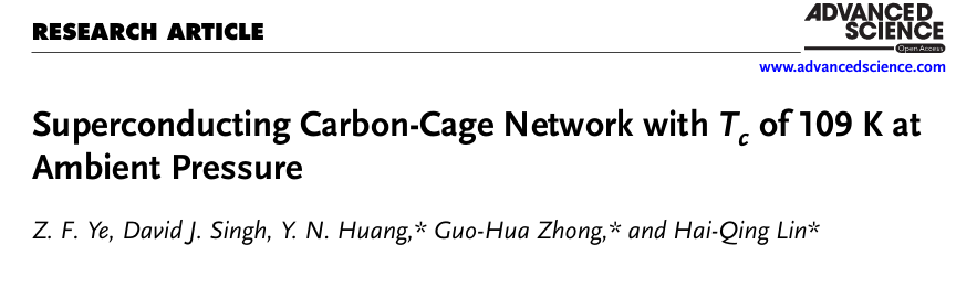 物理系黄衣娜副教授团队联合浙江大学、密苏里大学、和中国科学院深圳先进技术研究所在国际顶级期刊《Advanced Science》(中科院一区,Top,影响因子14.3)上发表了题为“Superconducting Carbon-Cage Network with Tc of 109 K at Ambient Pressure”的研究论文。bbin-bbin平台