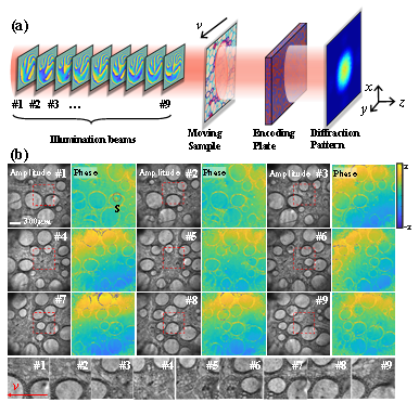单次多帧相位成像在检测连续极端物理现象中发挥着重要作用,尤其对于不可重复变化和不确定性的介质密度测量,具有独特的优势。然而传统的超快成像很难实现相位测量,对于一般的多帧相位成像方法,空间分辨率和信噪比受限于成像帧数。在这项研究中,我们提出了一种基于轨道角动量复用编码的相干衍射成像方法。该方法采用一系列多涡旋照明场,并结合波前调制以及涡旋复用相位检索算法,实现对动态样品的多模态复振幅成像。实验结果表明,该方法能够从单个衍射光斑中实现对动态样本的9帧高分辨率相位成像,空间分辨率可以达到9.84 µm,相位测量误差达到4.7%,有效解决了传统成像方法的局限性。该方法提供了一种轨道角动量的复用维度,并在研究半导体缺陷或瞬态连续现象方面具有潜力。(应用物理:孙明丽 学科办:陈璟)