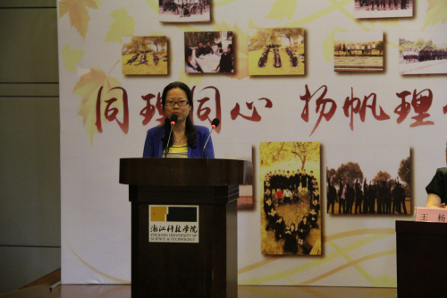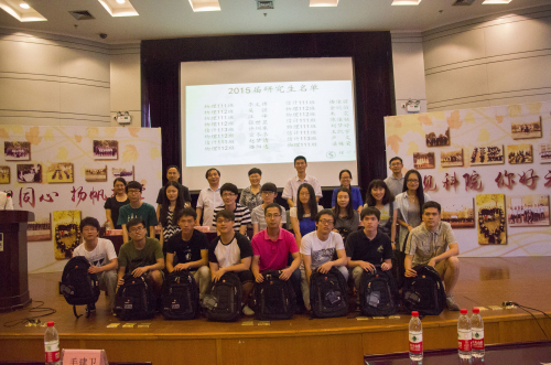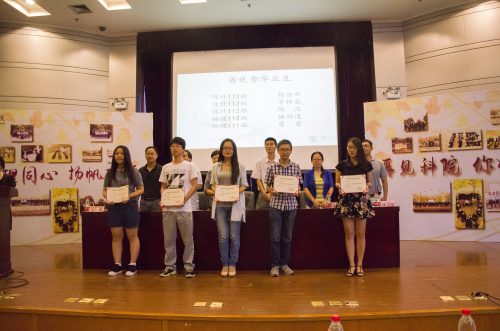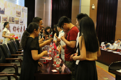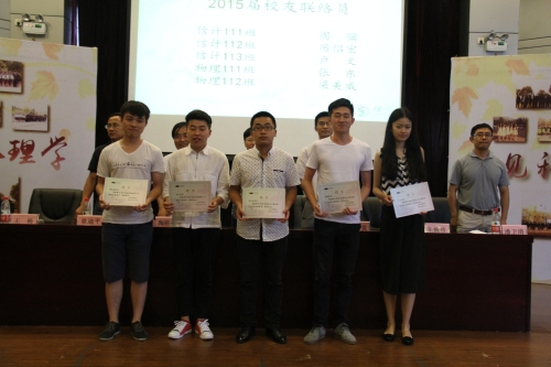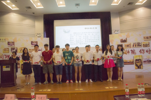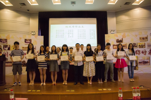 为2015届省、校优秀毕业生和考研出国留学学生及校友联络员颁发了荣誉证书、纪念品和聘书,还未毕业生代表佩戴了校训纪念章并赠送了学院专门定制的毕业礼物。
