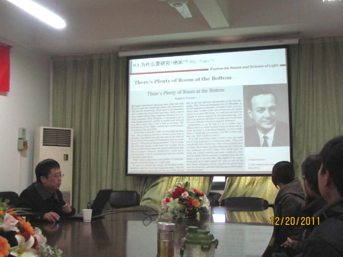 报告中,童利民教授就纳米光子学现状及其新前沿发展方向作了深入浅出的讲解,对浙江大学光电信息工程学系和现代光学仪器国家重点实验室情况进行了详细的介绍。童教授的报告深深的吸引着在场每一位师生,赢得了大家的热烈掌声。