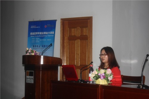 周度在讲座中介绍了她所参加过的电视创业大赛,例如《谁来一起午餐》以及《我为创业狂》等比赛,以及她目前的创业项目---职达求职青年旅社。