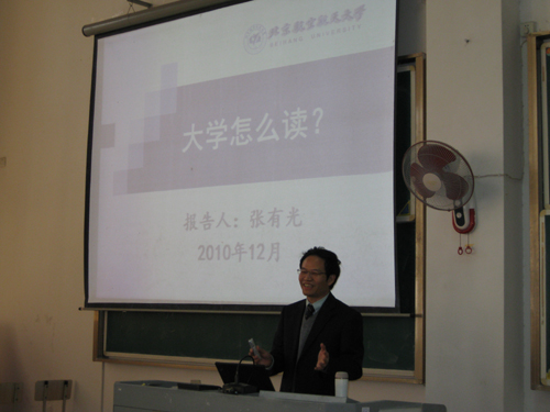 邀请北京航空航天大学博士生导师张有光教授为大一学生做了《大学怎么读?》的专题讲座。报告会由数学与信息科学系系主任朱婉珍老师主持,bbin