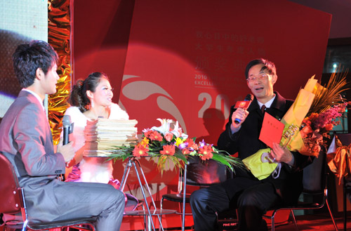 12月26日晚,2010年“我心目中的好老师”暨“大学生年度人物”颁奖典礼隆重举行,校党政领导徐志平、杜卫、陈根芳、周加敏、吕进、赵东福、冯军、郑友取、毛建卫、正校级巡视员胡浙平及各二级学院负责人出席颁奖典礼。 校党委书记徐志平在颁奖典礼开始前作了热情洋溢的讲话。他向获奖的大学生心目中好老师和年度人物表示最热烈的祝贺,也希望全校各级单位和广大师生,以全面建设特色鲜明的高水平应用型大学为目标,以先进典型为榜样,围绕科学发展、创新发展和特色发展,把各项工作落到实处,实现“十二五”发展开好局、起好步。 今年我心目中的好老师和大学生年度人物的主题是“爱与责任•青春力量”。王长荣、卢艺舟、刘士旺、陈军统、易翔宇、胡开堂、段福斌、徐向东、葛丁飞、Ralf Mayenberger(德国)等十位老师以其精湛的教学艺术、对学生的无限关爱和付出而受到同学们的喜爱,最终入选学生心目中的好老师。吴司韩、方肇初、李婷婷、李鑫东、苏雁、金洪峰、赵力波、章艳华、温明圣、裘梦媛等十位同学当选“大学生年度人物”。 本次评选从历经推选、投票、专家评审等各环节,最终评选出十位我心目中的好老师和十位年度人物。