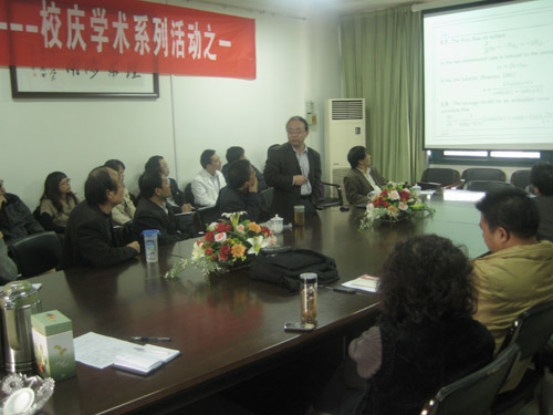 报告会上,屈长征教授首先列举了几类抛物型方程基本解的形式,由此引出解的对称性的概念,以及与对称性相关的各类问题。他指出解的对称性与解的几何性质的关联,并阐述了自己在这方面的一系列研究成果。屈教授将几何与分析巧妙的联系和结合,为在座师生进行数学研究提供了新颖的思路和想法。会后,许多老师还就具体问题与屈教授进行了探讨。