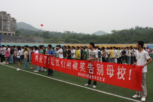 6月24日,学校在运动场隆重举行了2009届毕业典礼。在典礼现场的毕业生队伍中,一条红色横幅格外引人注目,上面写着:再见了!让我们用微笑告别母校!这是bbin